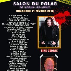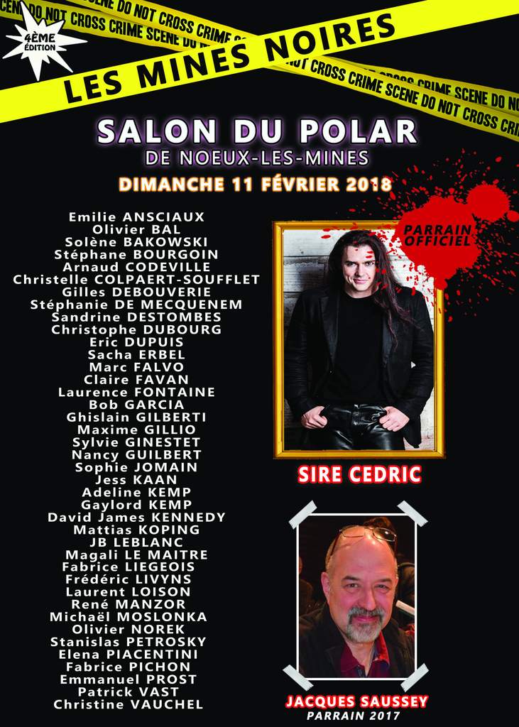 Parrainé par Sire Cédric (Du feu de l’enfer - Presses de la Cité) - Toucan Noir), la 4ème édition du salon du polar Les Mines Noires, se déroulera le 11 février 2018 à Noeux Les Mines (62) en compagnie de nombreux auteurs.