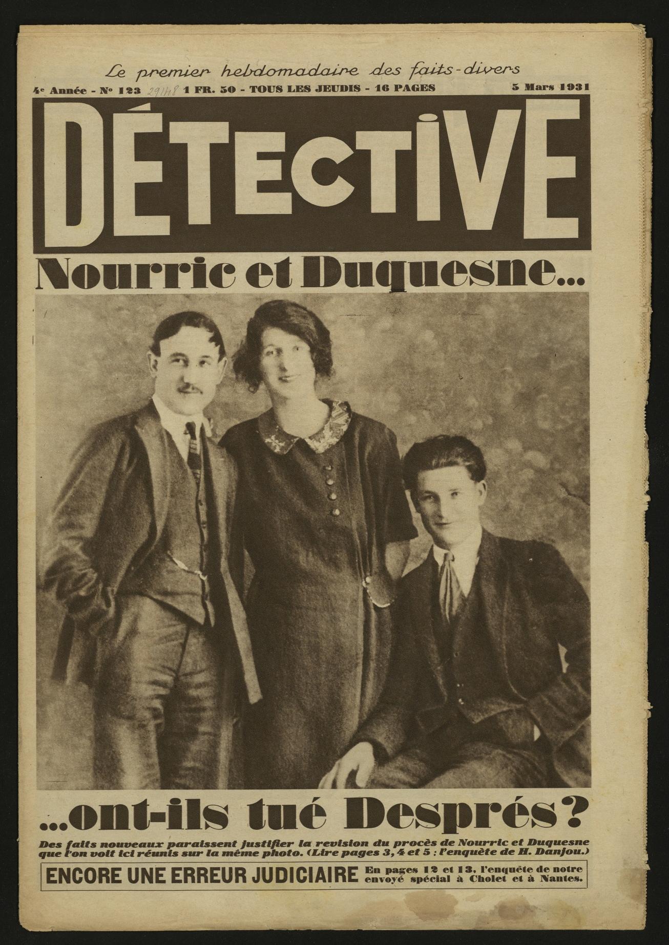 Marie-Eve Therenty : Comme beaucoup de gens de ma génération, j’ai louché enfant, sur le chemin de l’école, sur les gros titres de Détective devant les marchands de journaux : "Il tue ses parents, ses enfants et pour finir, il égorge son poisson rouge". Ce n’était pas le Détective sur lequel porte notre exposition d’ailleurs mais son successeur, beaucoup plus trash.