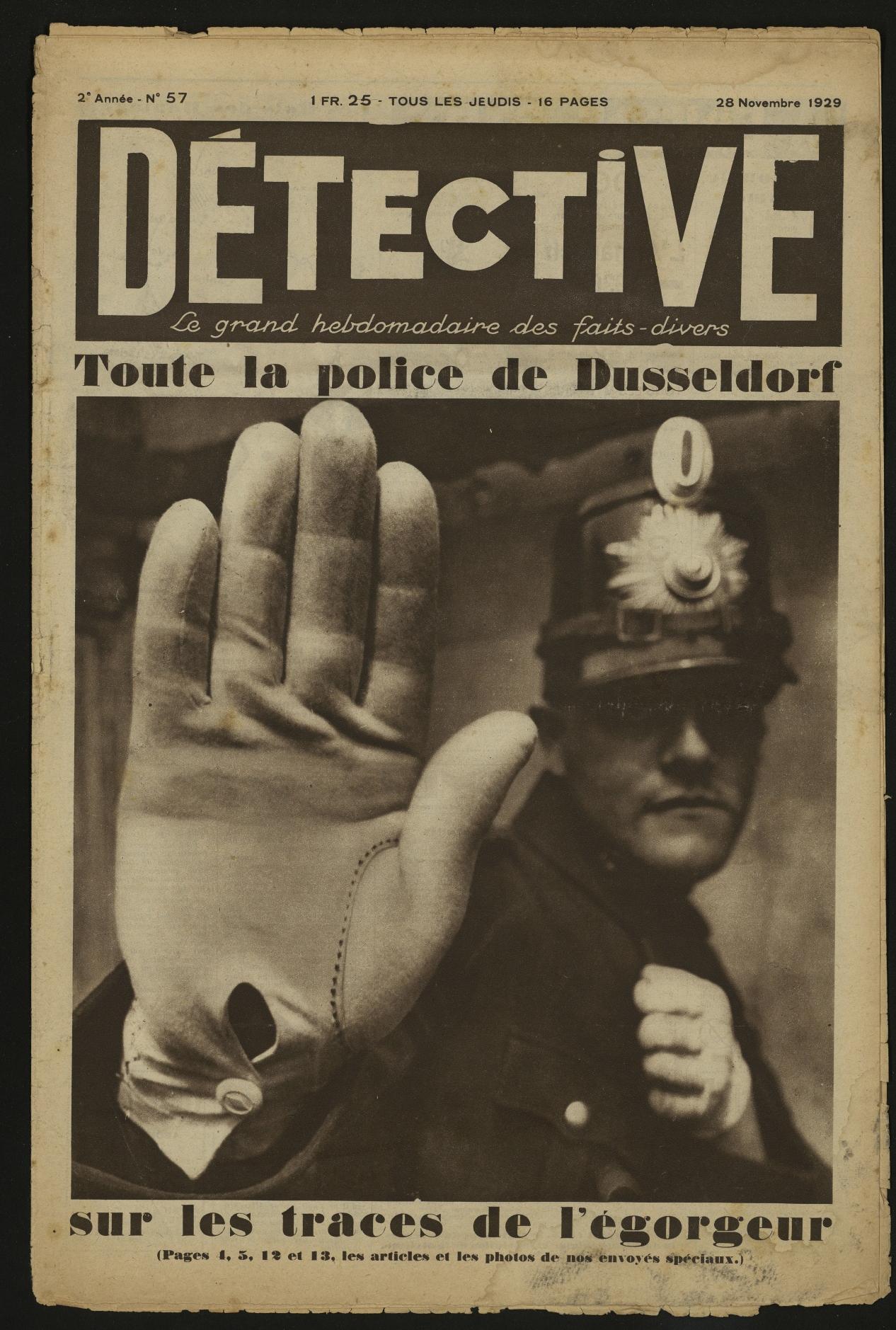 Je m’interroge sur cet hebdomadaire depuis que j’ai découvert qu’il avait été créé par Gallimard à la fin des années vingt. Je travaille depuis longtemps sur les écrivains-journalistes et ce Détective avait une rédaction alléchante : Joseph Kessel, Carco, Mac Orlan, Simenon. Lorsque j’ai rencontré Catherine Chauchard, la directrice de la Bibliothèque des littératures policières, pour la première fois il y a quelques années et qu’elle m’a appris que la Bilipo avait une collection complète du journal et accessible, j’ai commencé à choyer l’idée d’étudier ce journal. Ensuite est venue l’idée de l’exposition, et du colloque puisque la numérisation permettait d’engager de nombreux chercheurs sur le corpus. Nous avons décidé de faire un catalogue quand nous avons compris que l’exposition n’épuiserait jamais le sujet.