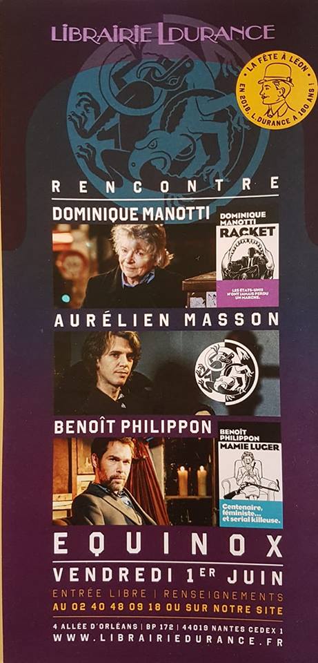 Vendredi 1er Juin, retrouvez Dominique Manotti (Racket - Les Arènes), Aurélien Masson (Collection Equinoxe - Editions des Arènes) et Benoït Philippon (Cabossé - Gallimard) pour une rencontre à la Librairie Durance à Nantes.