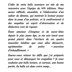 Retrouvez dans ce cahier de vacances quatre enquêtes imaginées par Franck Thilliez, le maître du roman policier ! Entraînez-vous grâce à des jeux et des énigmes avant de vous plonger dans chacune des nouvelles, puis laissez-vous guider par le cahier pour avancer pas-à-pas dans la résolution !