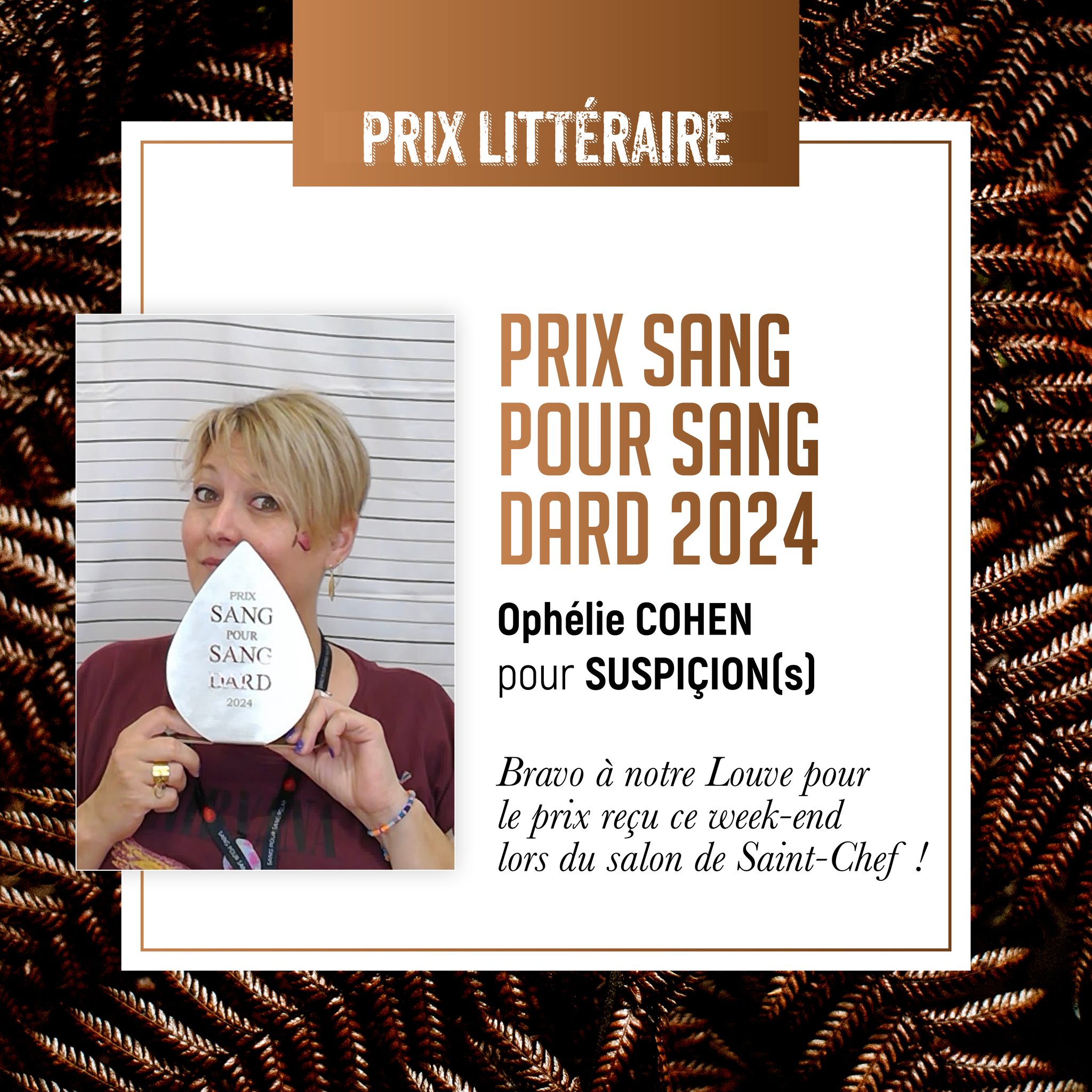 L’autrice vient de remporter le « Prix Sang pour Sang Dard » le week end dernier pour son roman Suspicion(s). Elle a reçu le prix des mains de Philippe Geluck.