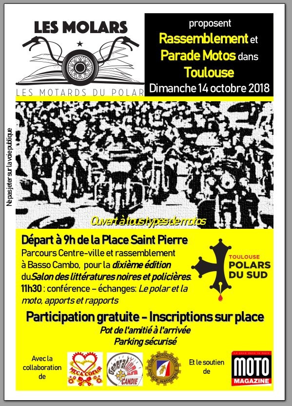 Venez assister dès 9h à un rassemblement à Basso Cambo puis à une parade de motos, qui sera suivie de la 10ème édition du Salon des littératures noires et policières - Toulouse Polars du Sud.